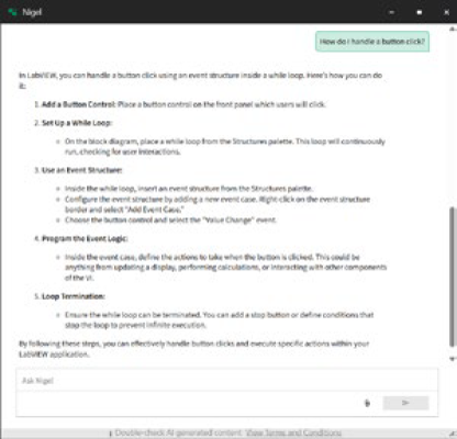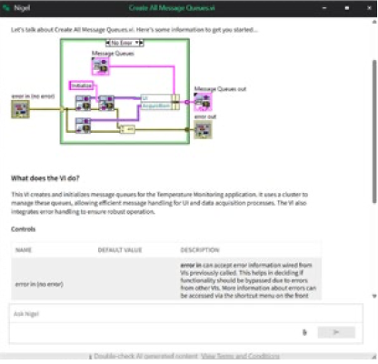 Need a function or example? Just ask Nigel. It will not only find what you need but also explain why it’s a good fit for your VI—helping you deepen your LabVIEW knowledge while accelerating your development.
